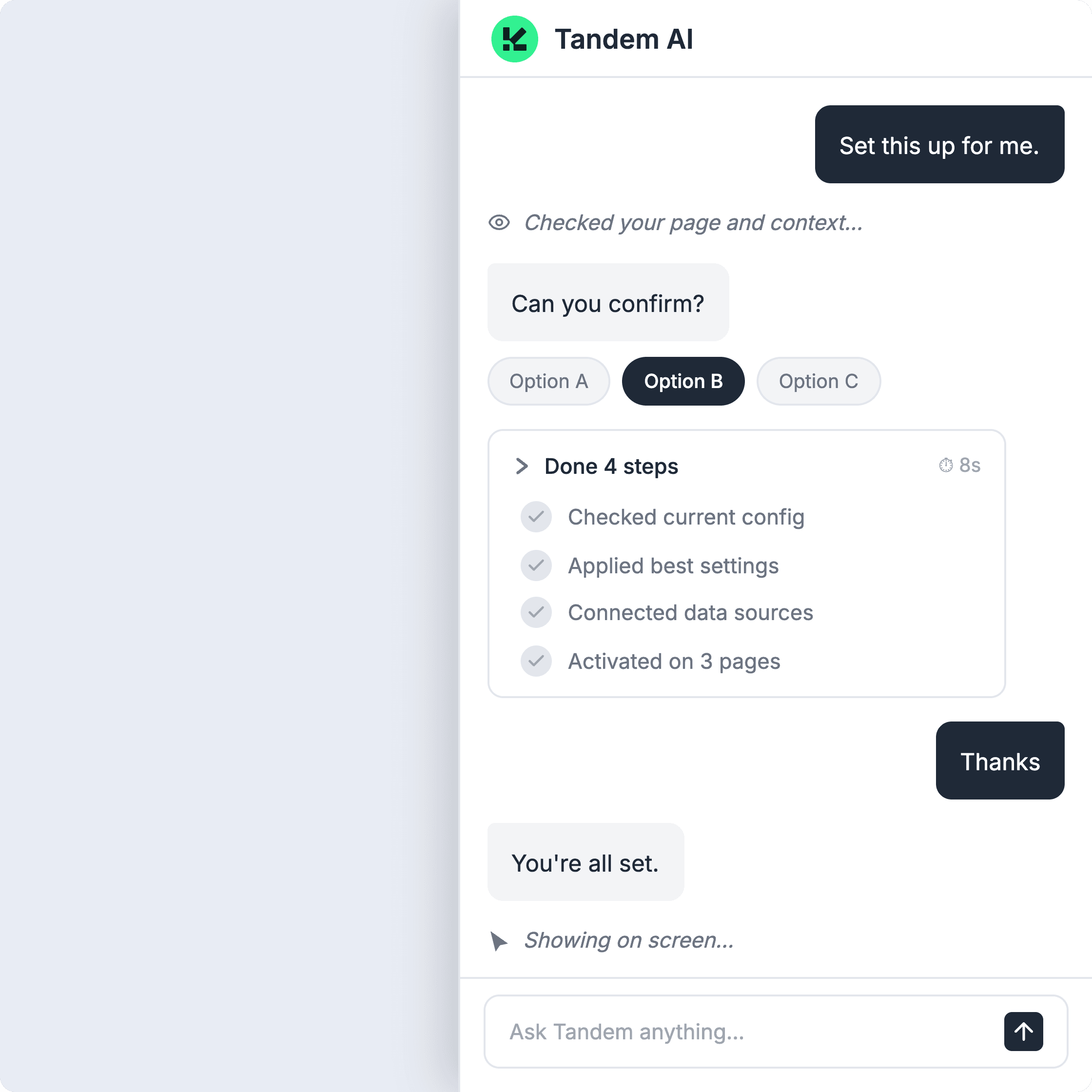 Tandem adapts or notifies you. In most cases, our AI experience continues. In many cases, it can even self-repair (detect if a button changed CSS selector for instance). Worst case, for major changes, it doesn't break. The user experience just reverts to your UI and you get notified. No broken experience.