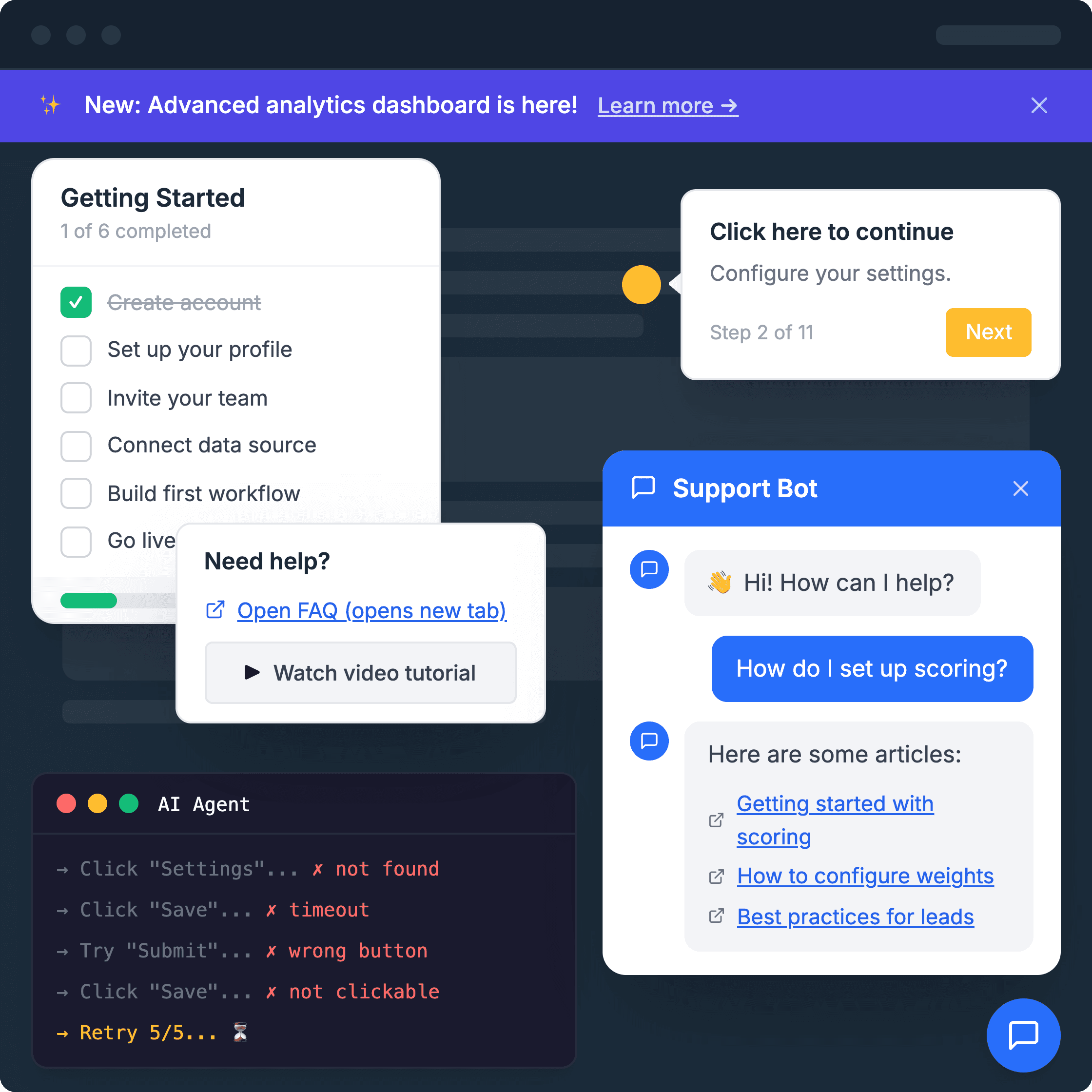 Help users master complex features without scheduling a call. Turn struggling accounts into power users.