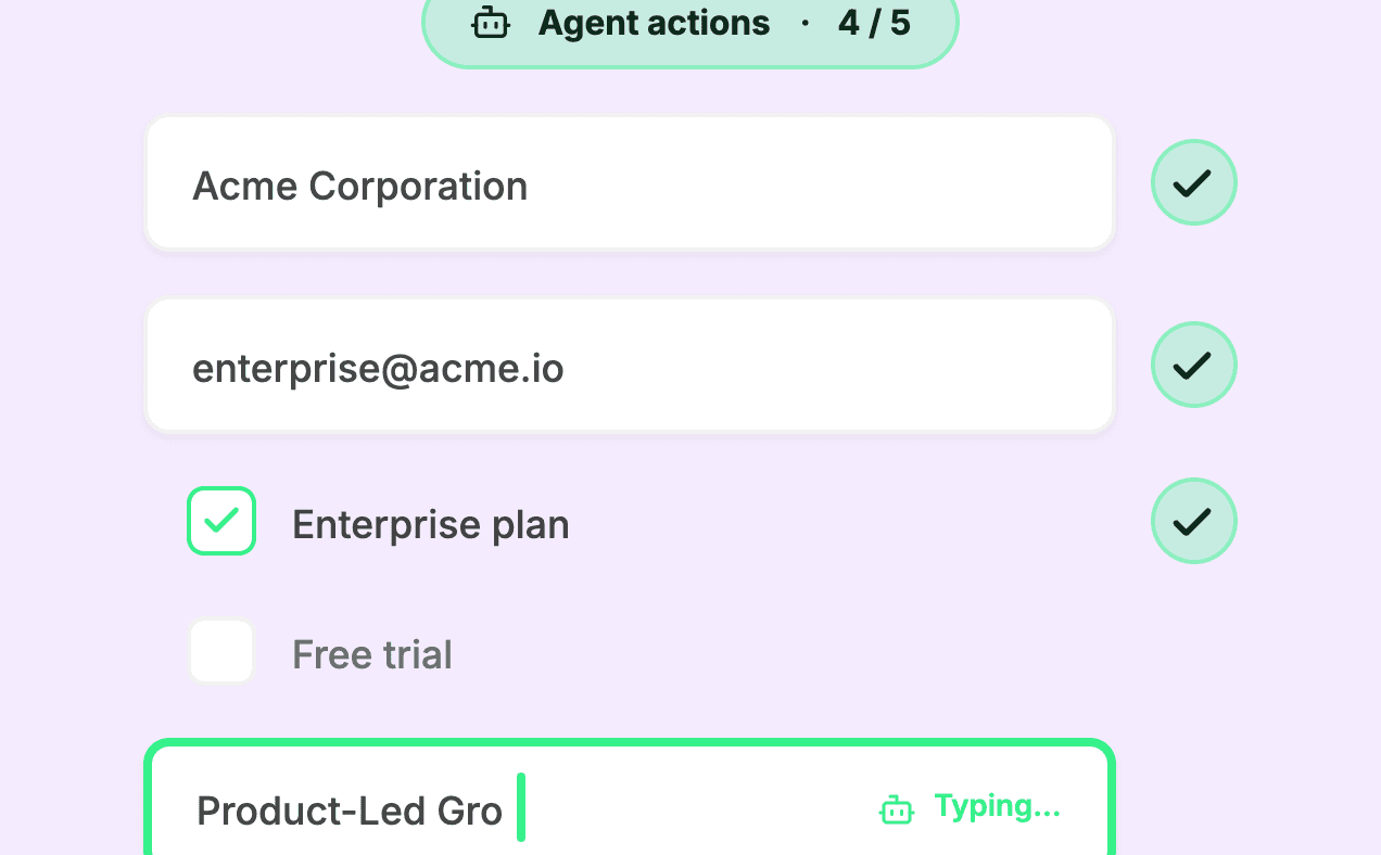 They can fill forms, click buttons, validate inputs, catch errors, navigate users through flows, pull data from your interface, and even complete multi-step workflows. Think of them as mini-employees inside your product who can see what users see and take action.